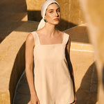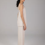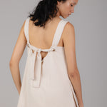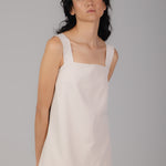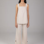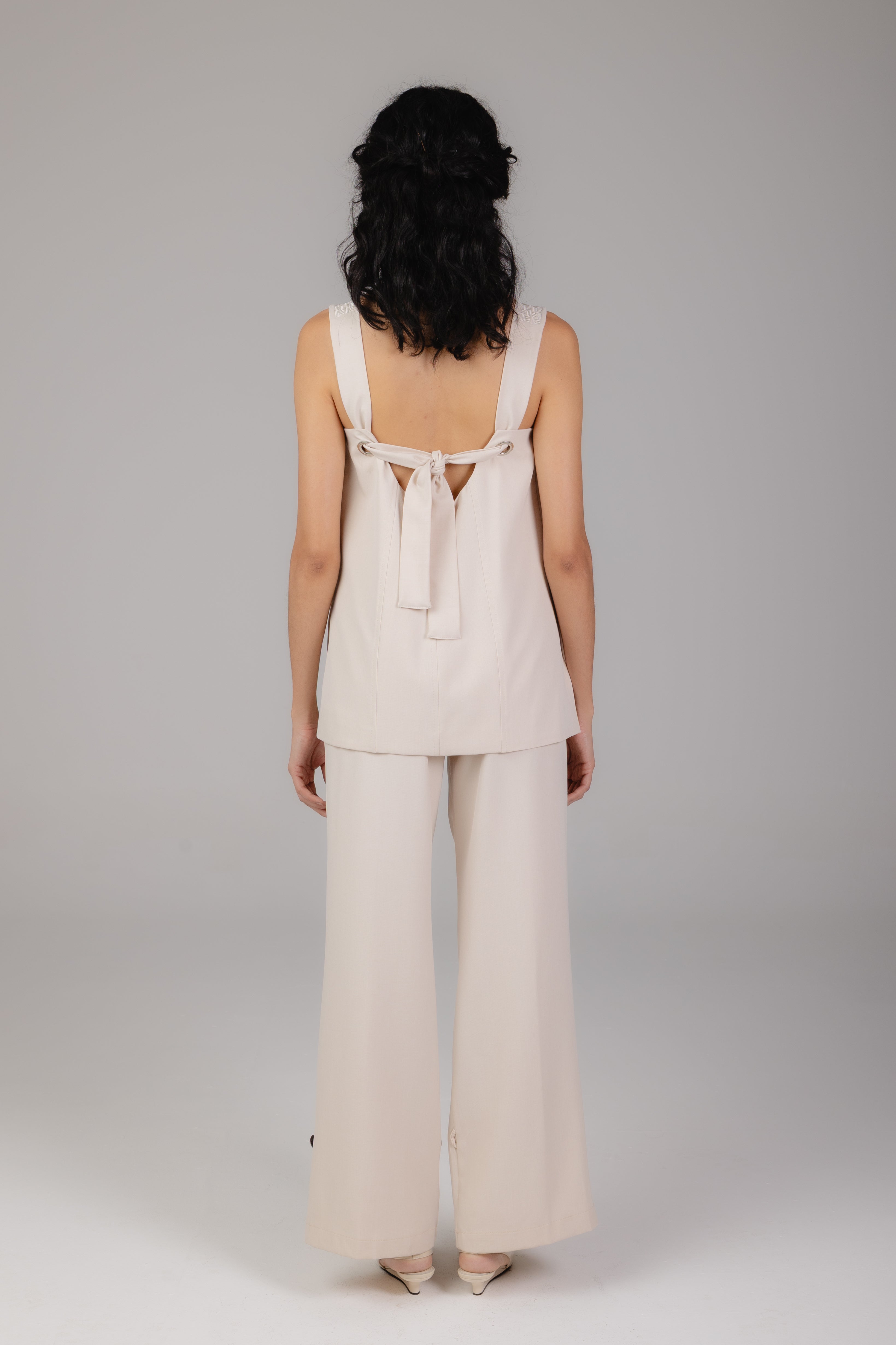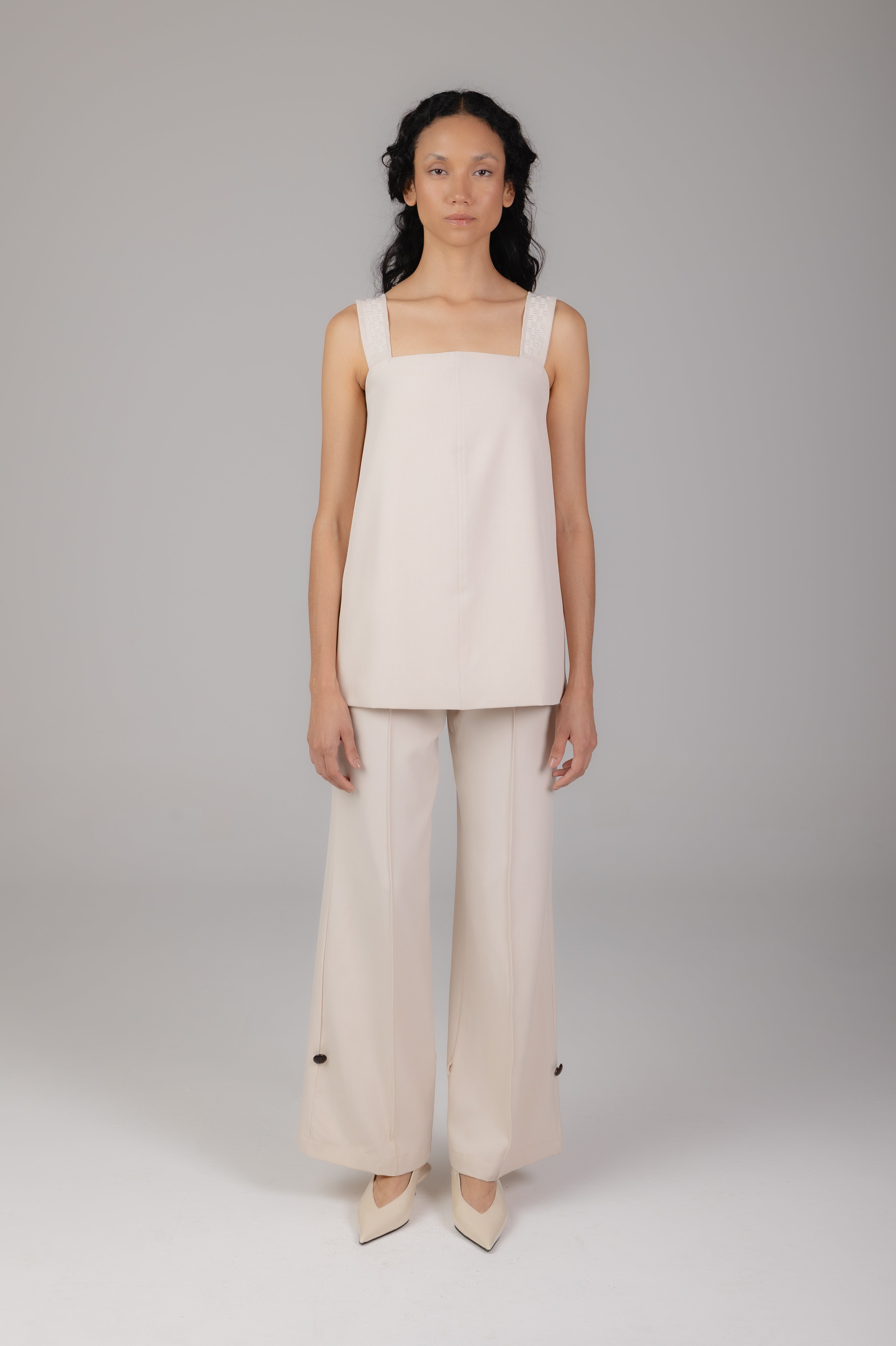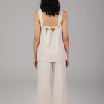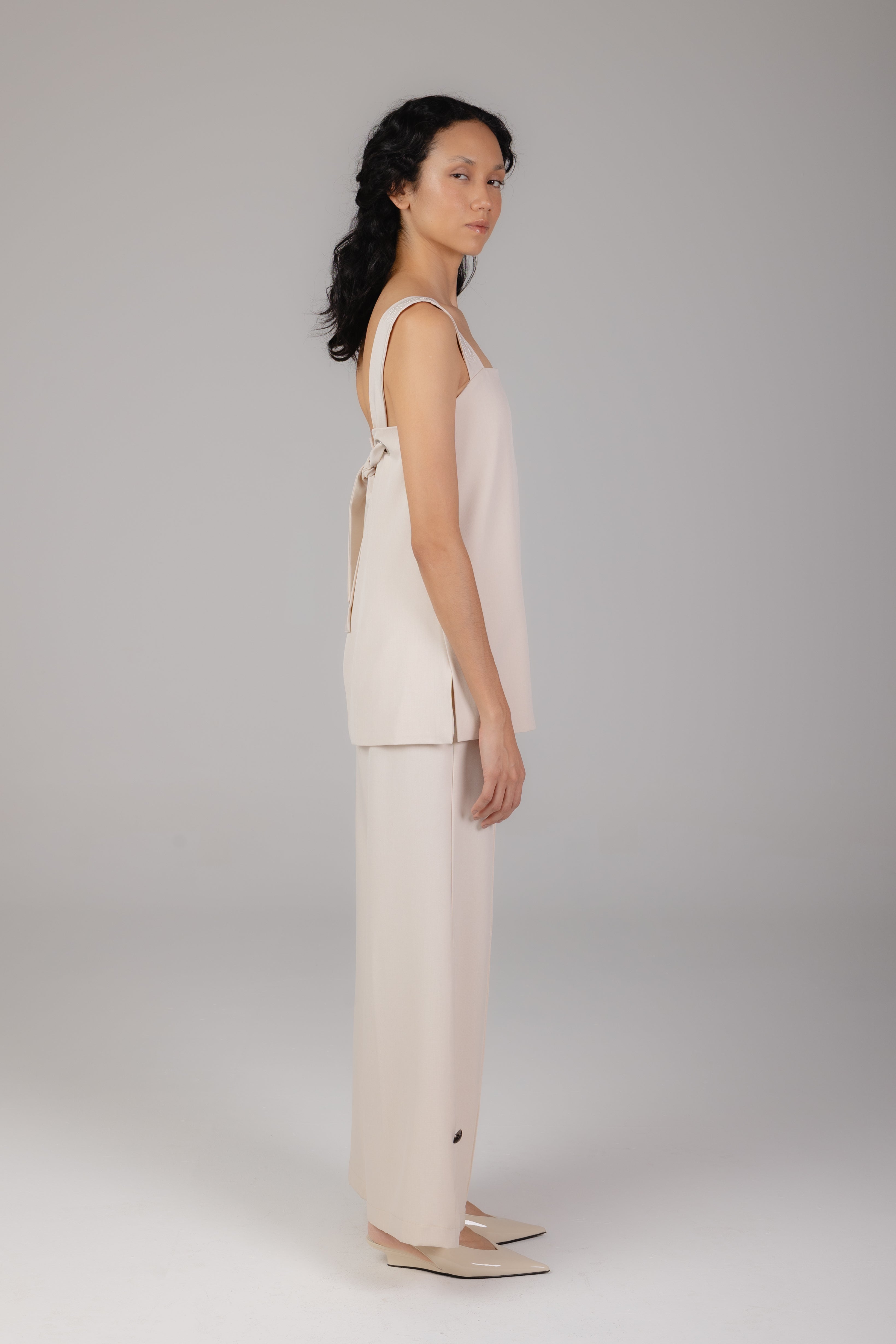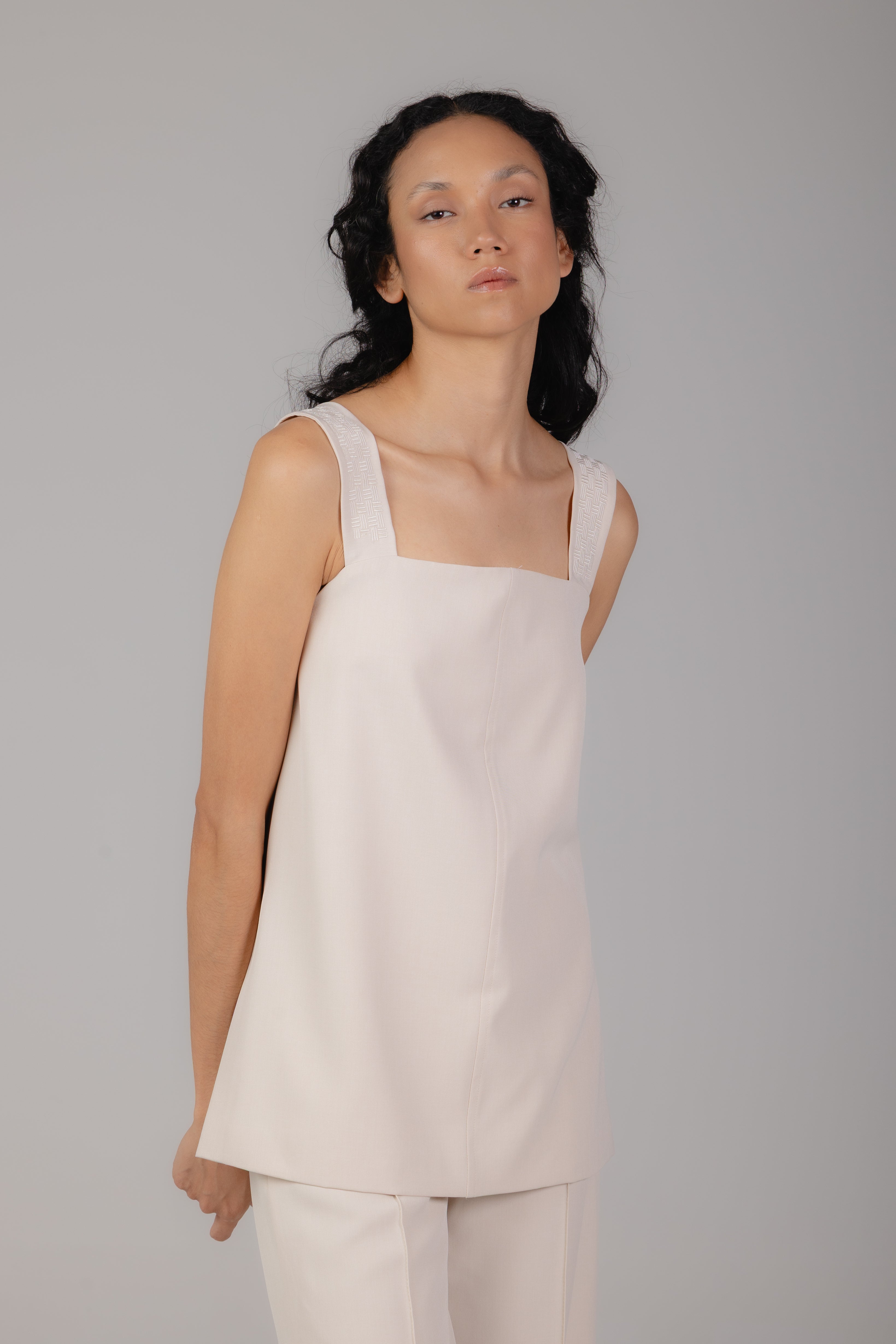 Blusa estructurada con escote recto y tirantes anchos con bordado. Su espalda abierta con amarre ajustable permite adaptarse al cuerpo con comodidad y elegancia. Presenta cortes limpios, caída recta y aberturas laterales discretas que aportan movimiento.