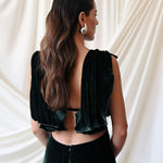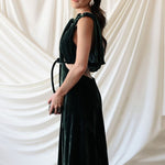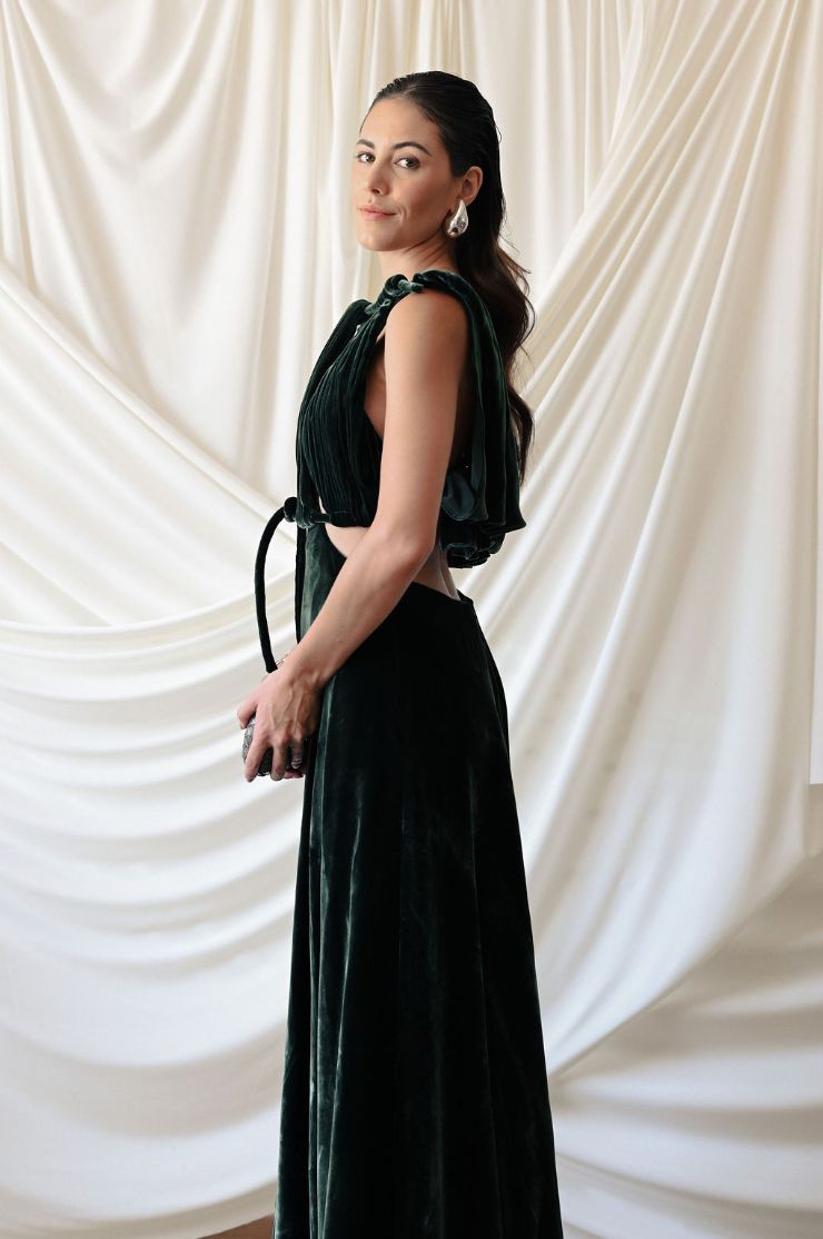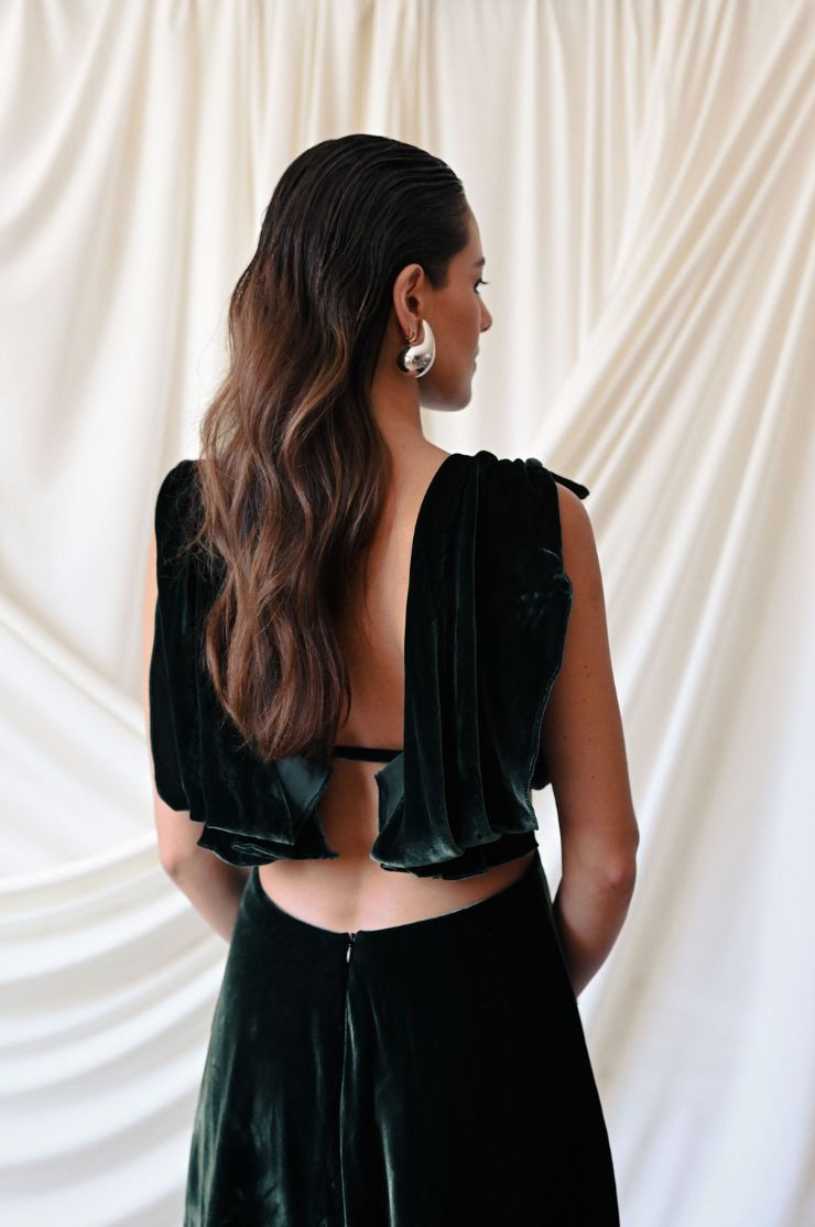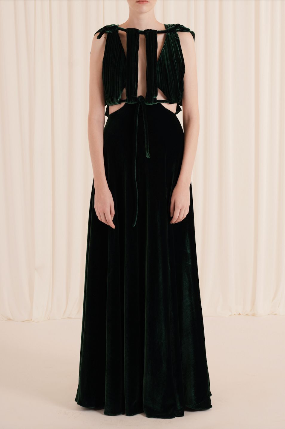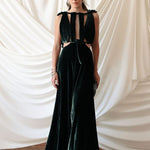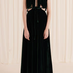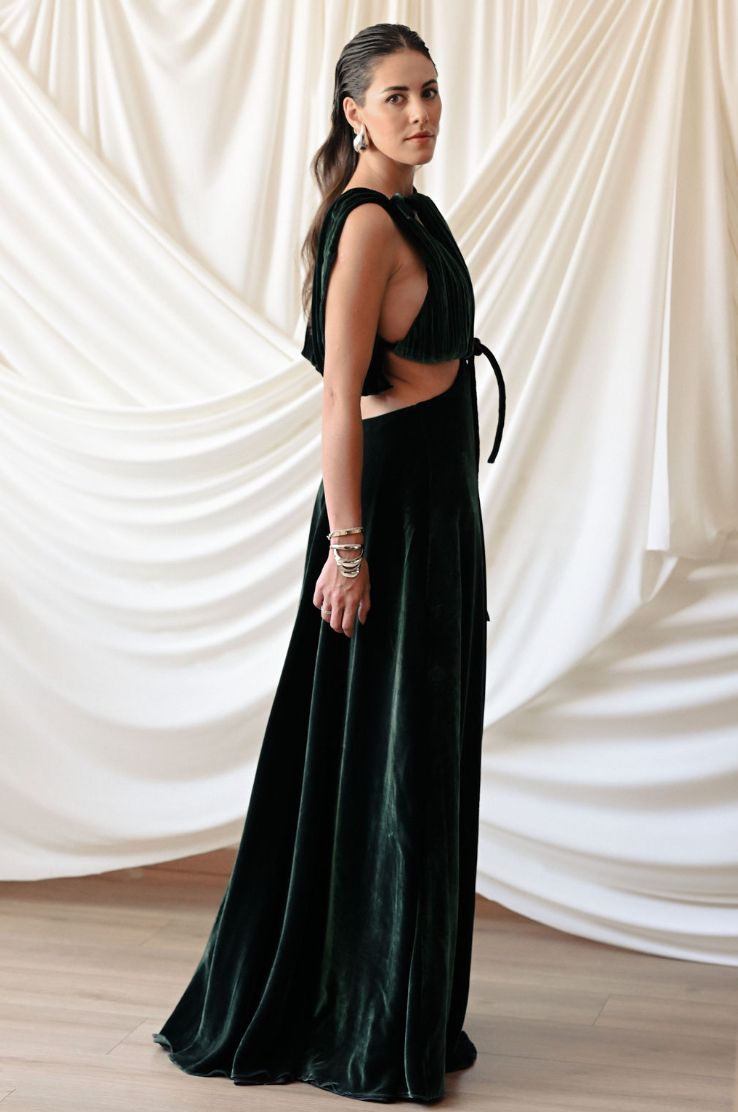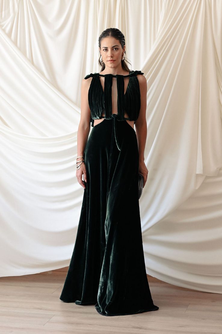 Vestido largo con escotes en la zona superior estratégicamente diseñados. Tiene tirantes que caen sutilmente sobre la espalda.
