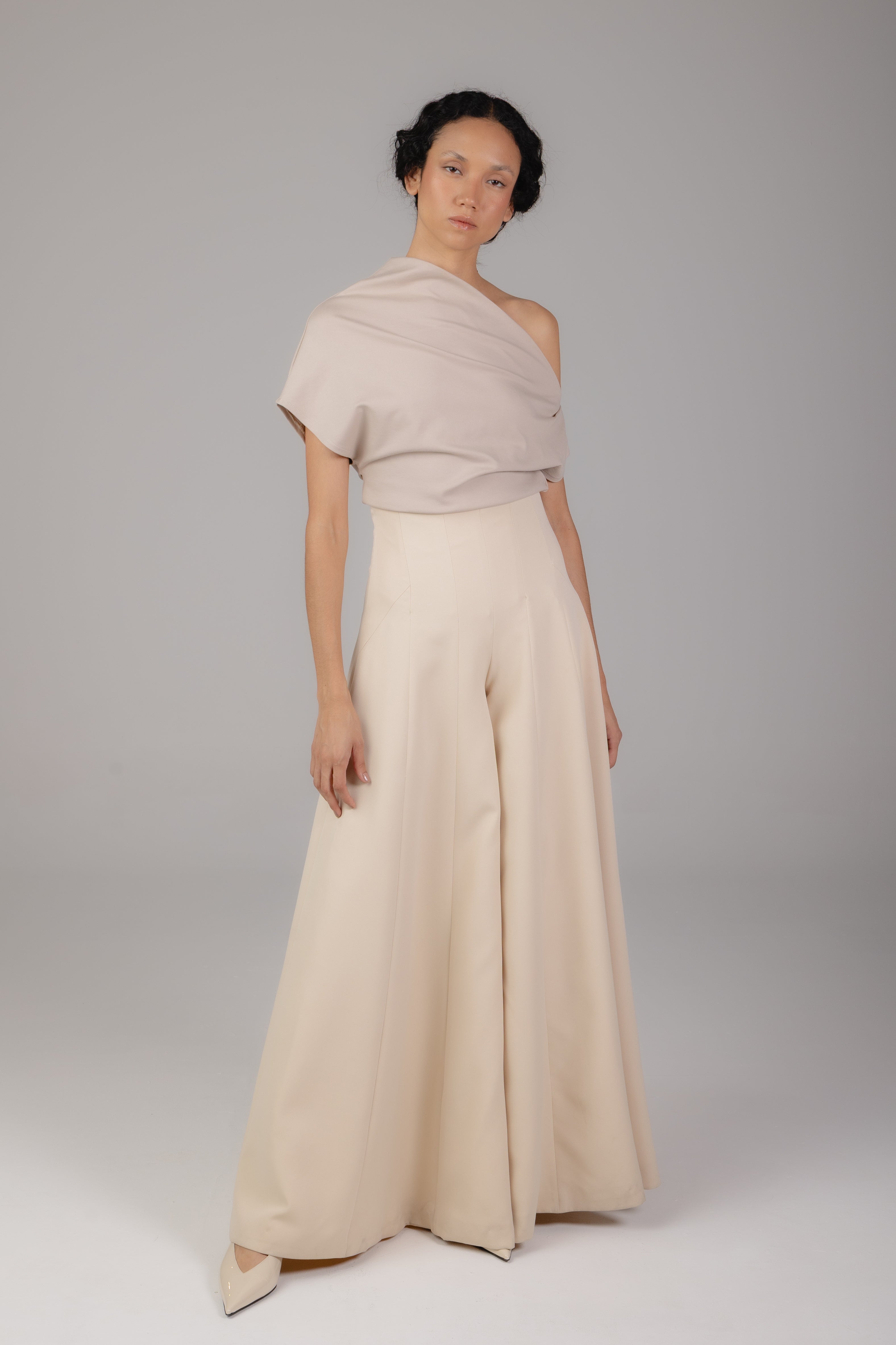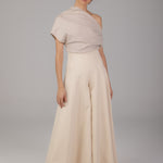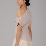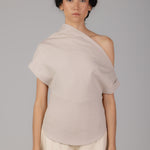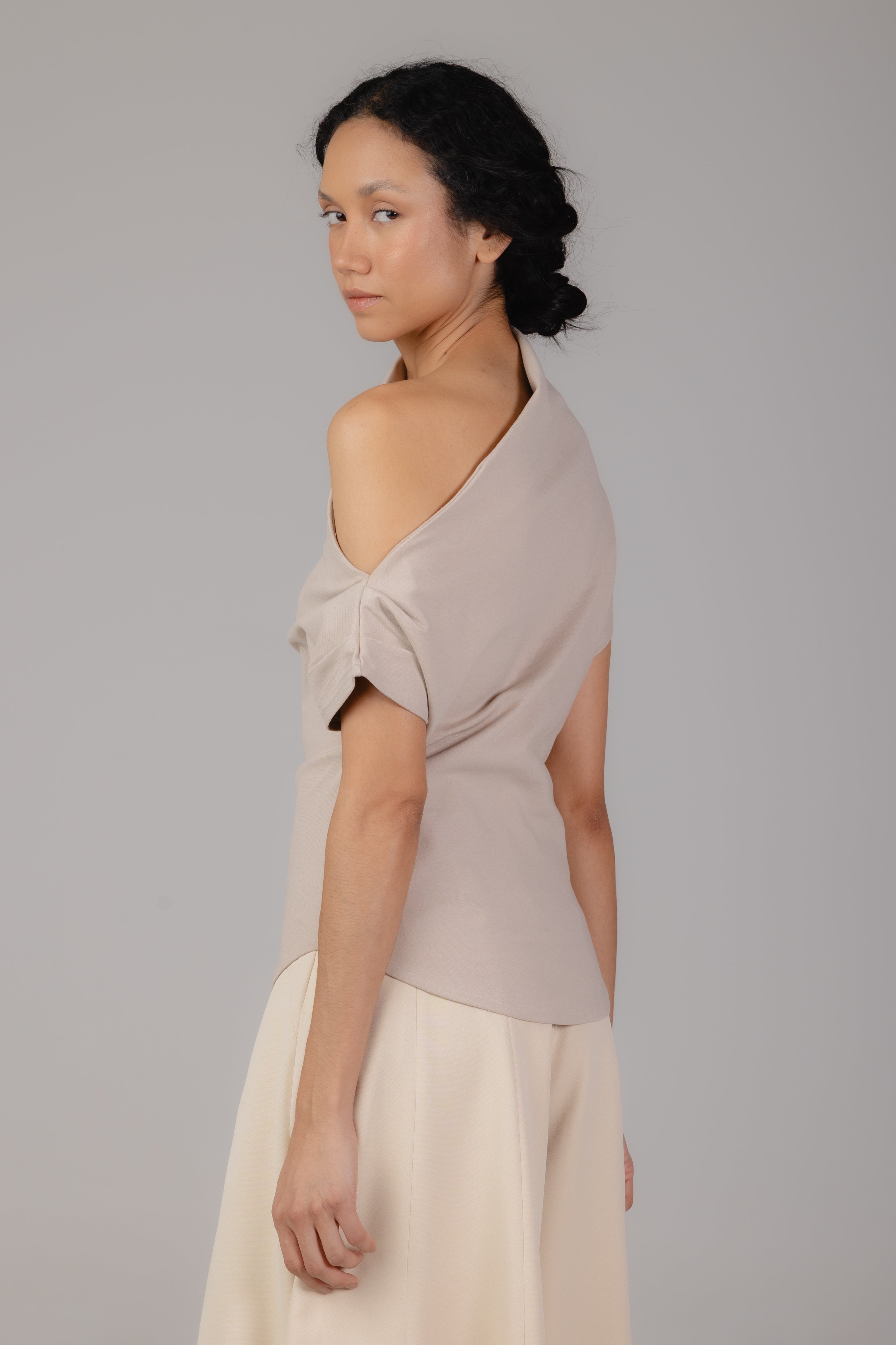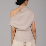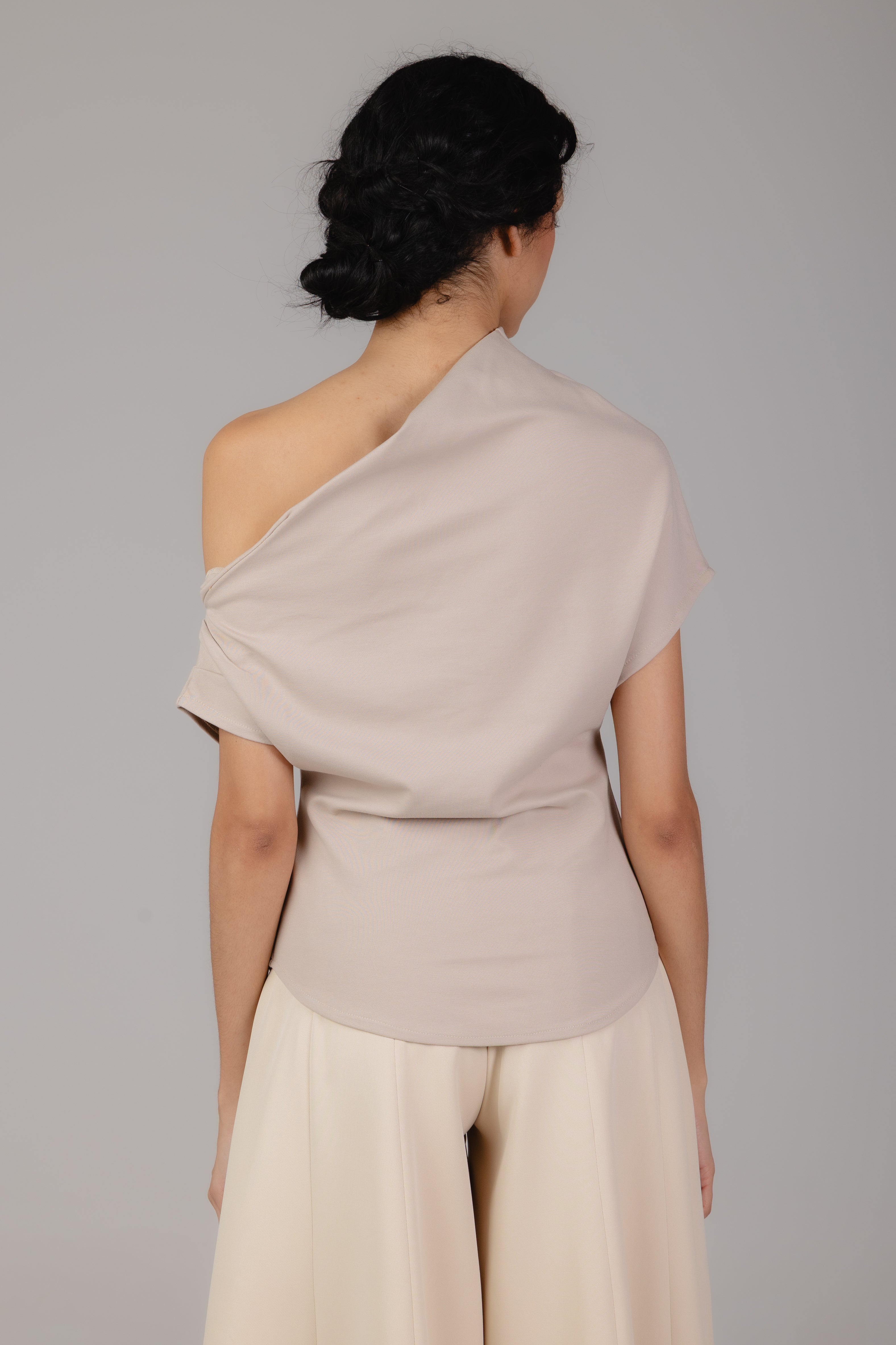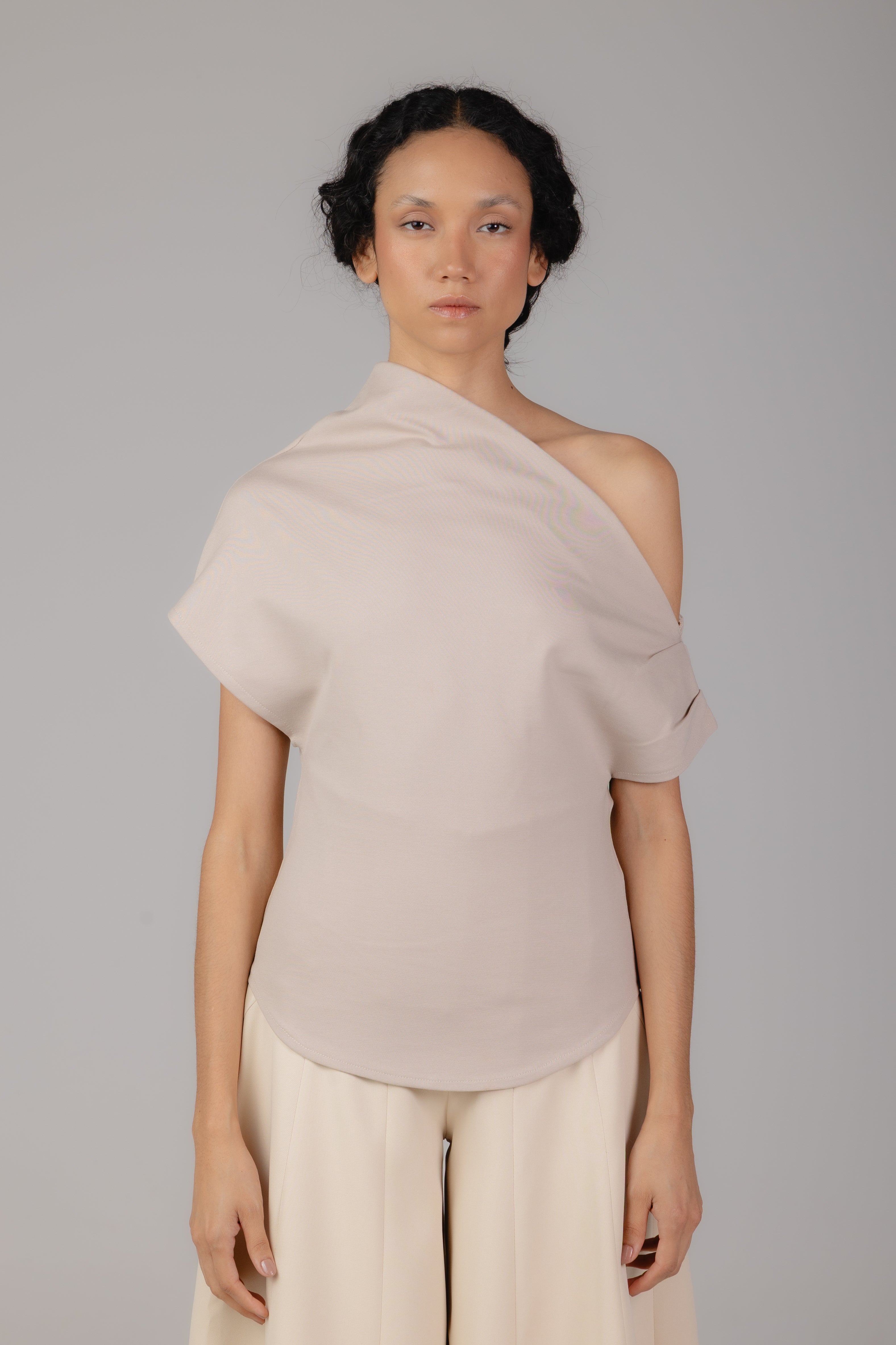 Blusa asimétrica de un hombro caído, confeccionada en tela suave y estructurada. Su diseño envolvente crea una silueta limpia que se adapta con fluidez al cuerpo. El dobladillo redondeado añade un acabado pulido y favorecedor. Una pieza esencial que combina versatilidad y sofisticación, ideal para transiciones entre lo casual y lo formal.