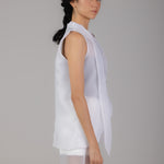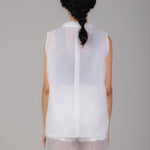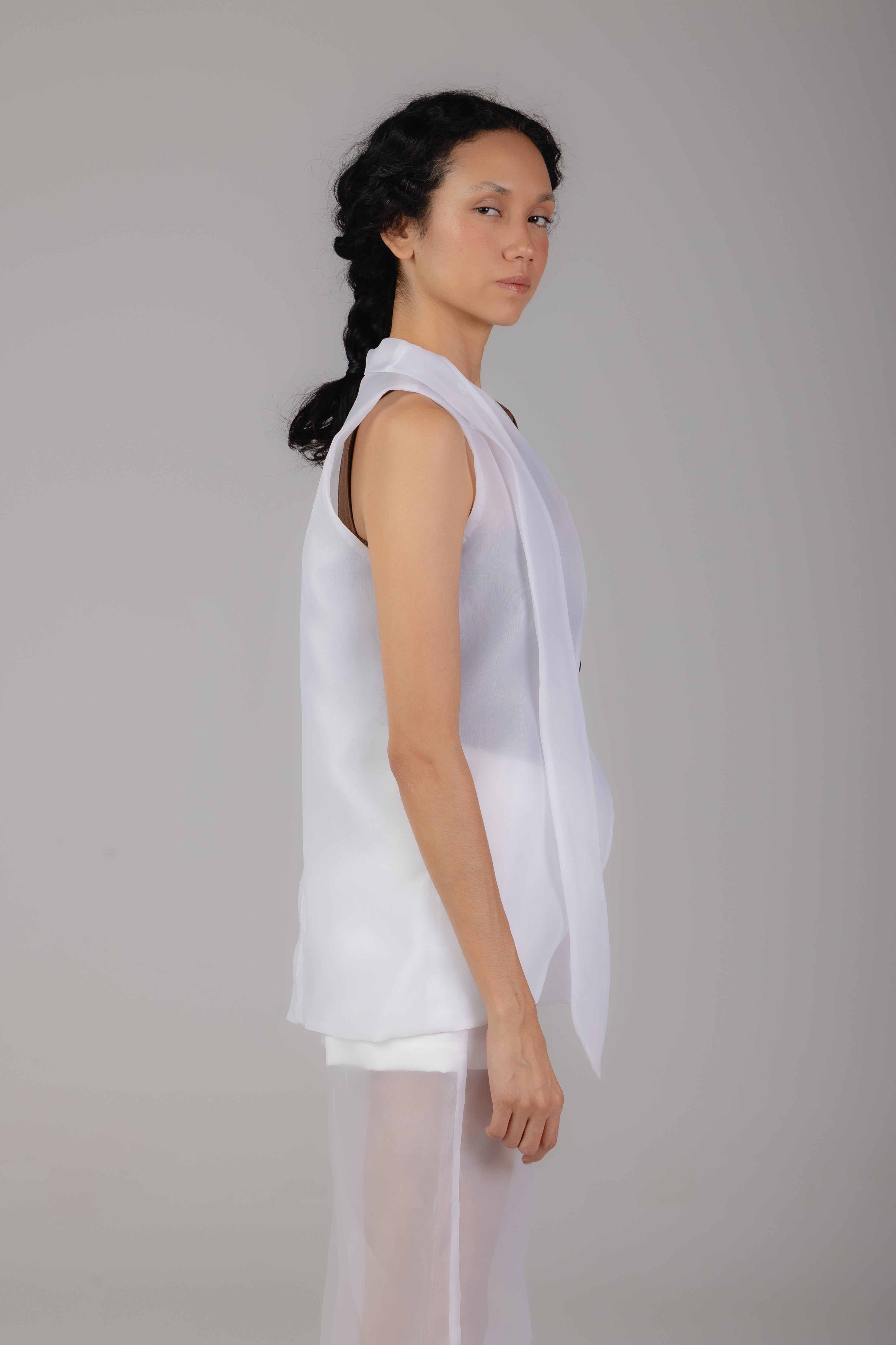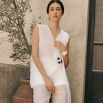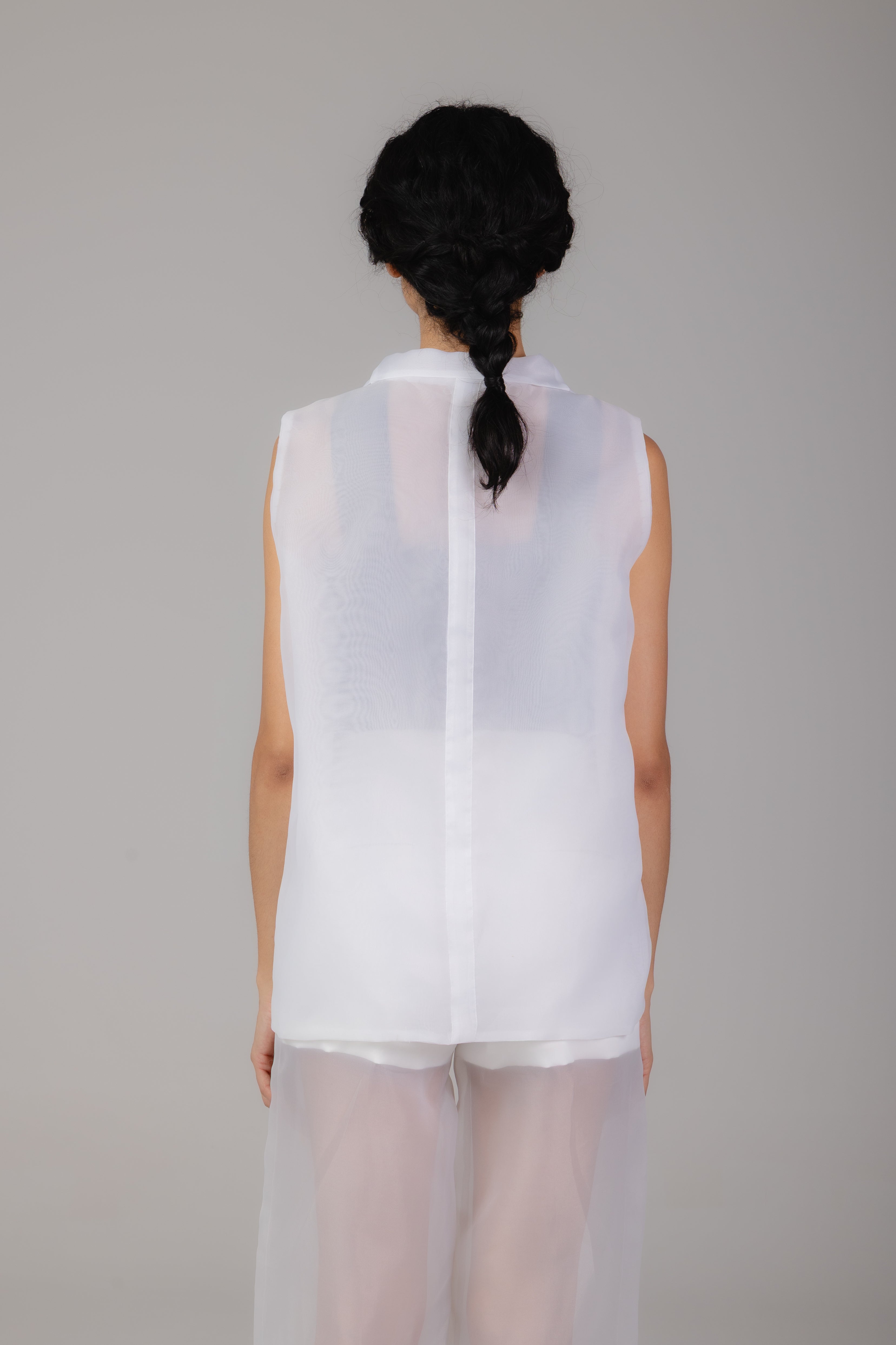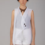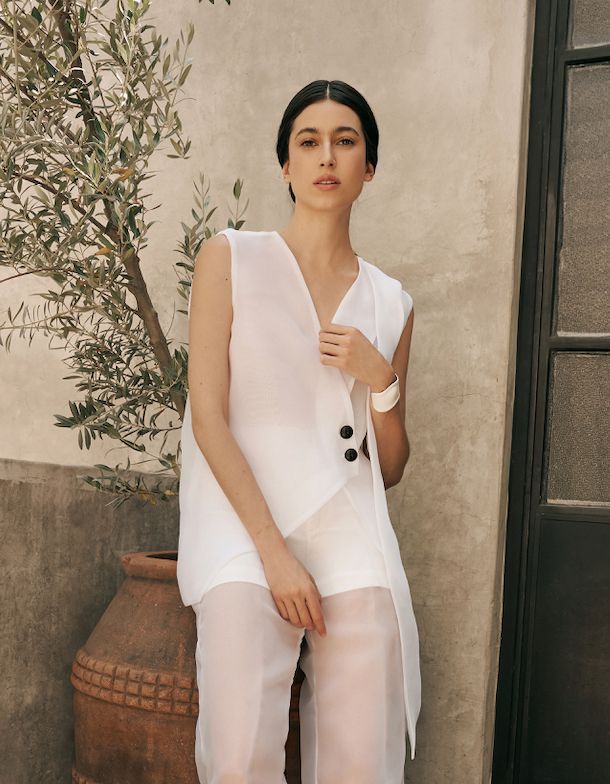 Chaleco largo de organza ligera con cierre cruzado y solapa amplia de una sola capa que cae al frente con movimiento.Una caída libre que juega con la transparencia y la superposición. Detalle de doble botonadura en contraste que aporta fuerza visual a una silueta etérea.