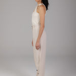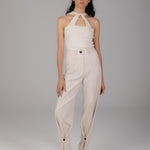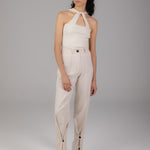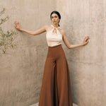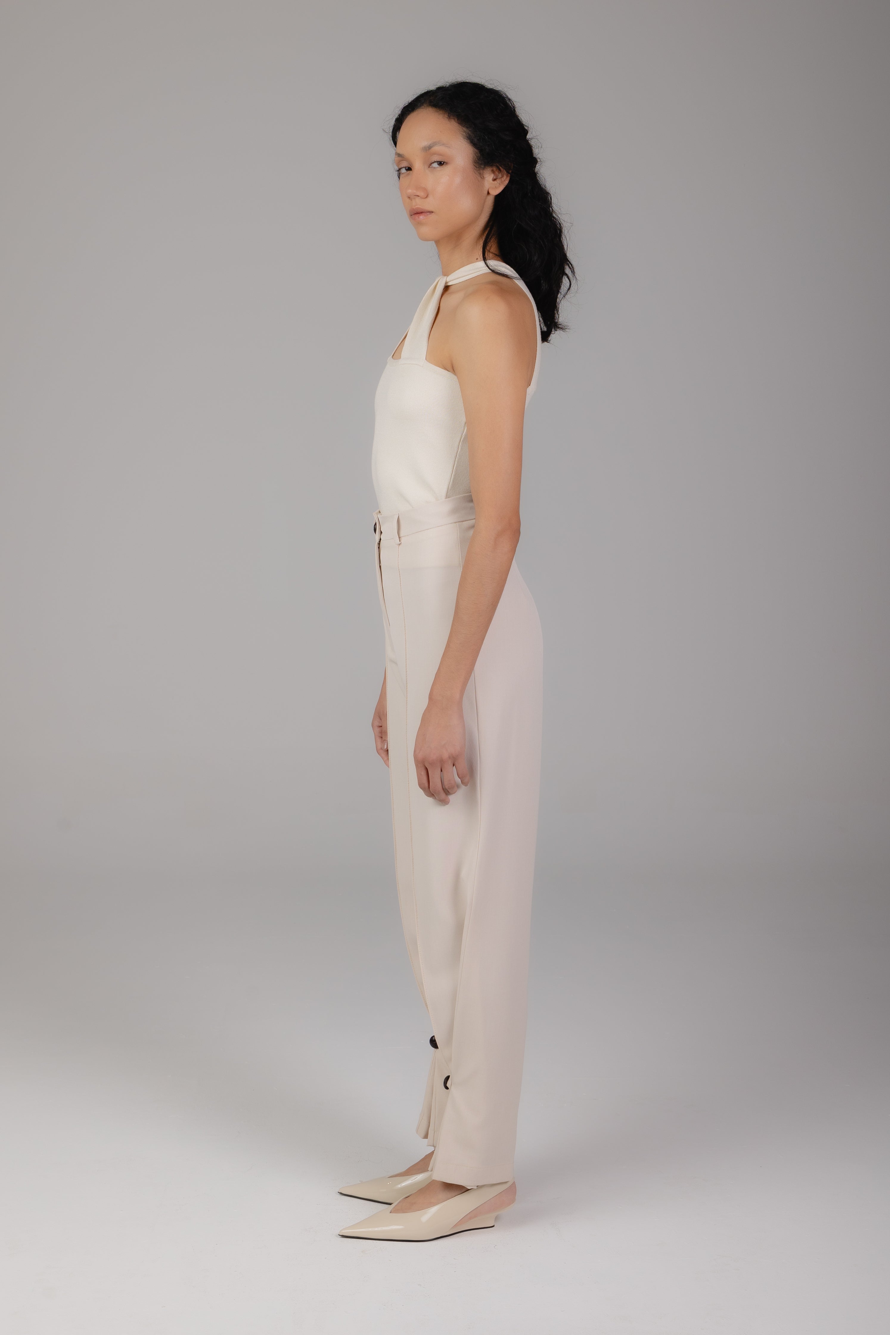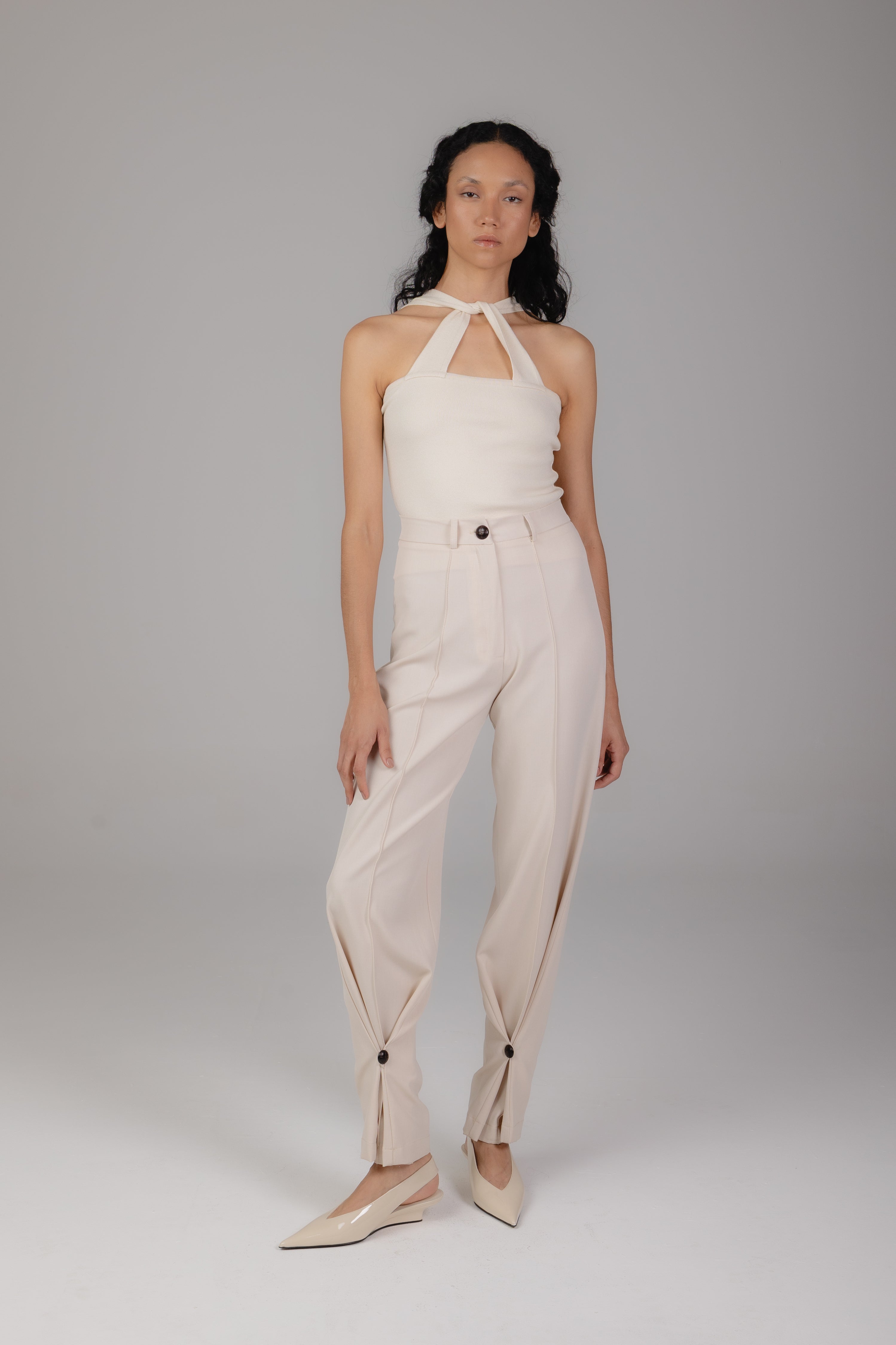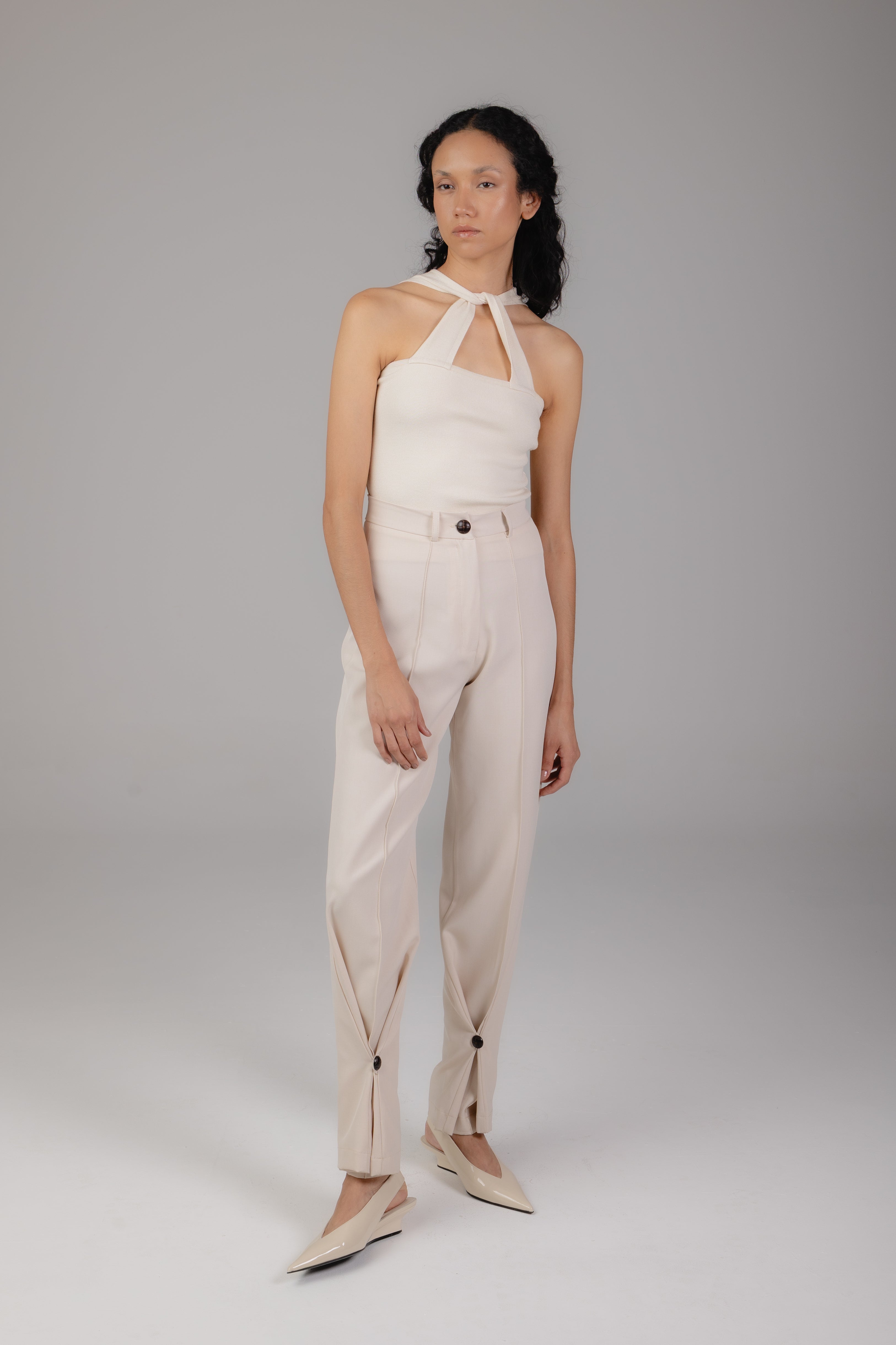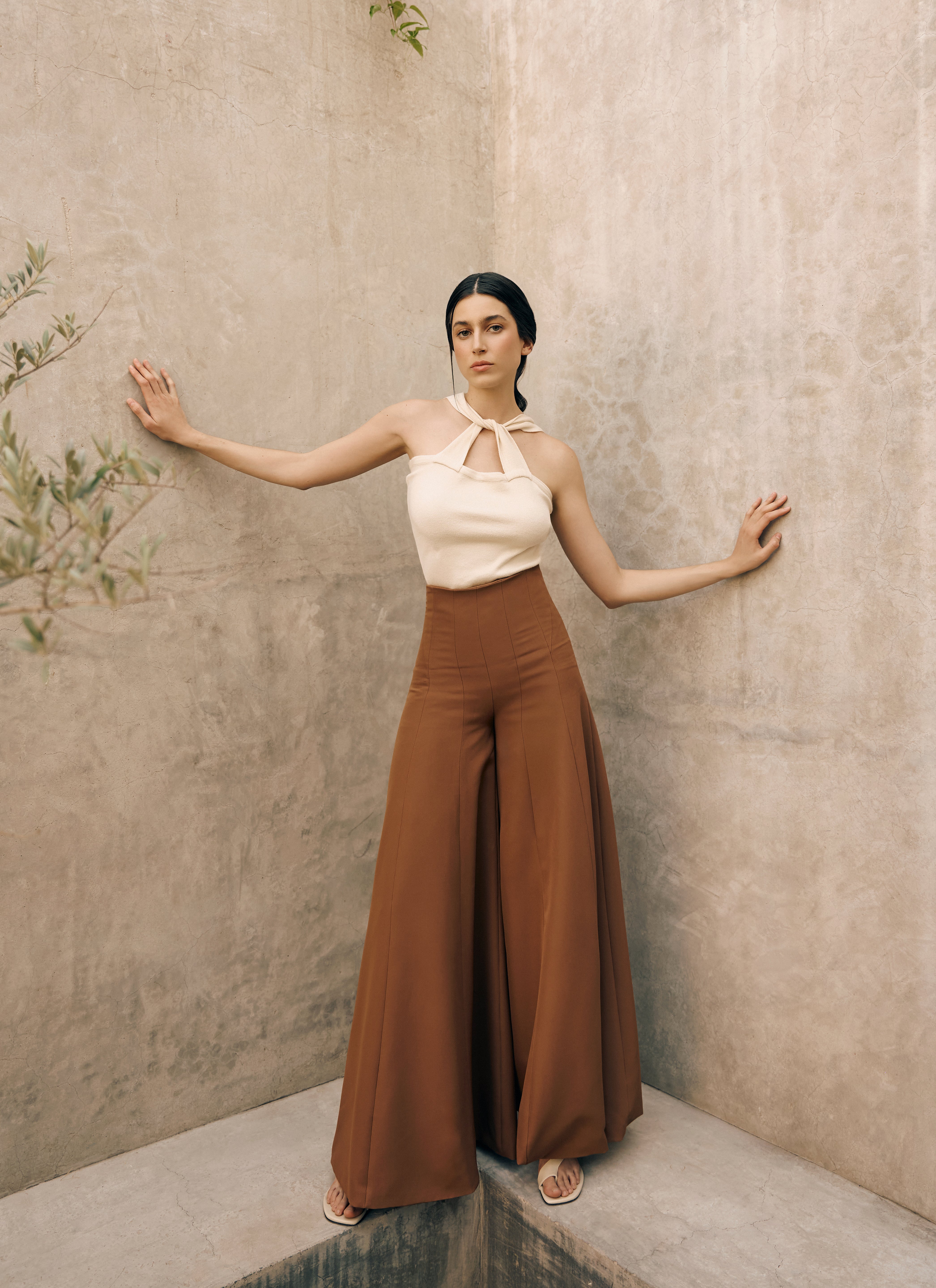 Top de tejido de punto con escote cuadrado y tirantes gruesos que se cruzan al frente, creando un diseño tipo nudo con abertura central. Su textura suave y elástica brinda ajuste cómodo al cuerpo sin perder estructura. Ideal para estilizar con pantalones sastre o faldas de tiro alto. Una pieza esencial con carácter.