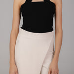 Top de tejido de punto con escote cuadrado y tirantes gruesos que se cruzan al frente, creando un diseño tipo nudo con abertura central. Su textura suave y elástica brinda ajuste cómodo al cuerpo sin perder estructura. Ideal para estilizar con pantalones sastre o faldas de tiro alto. Una pieza esencial con carácter.