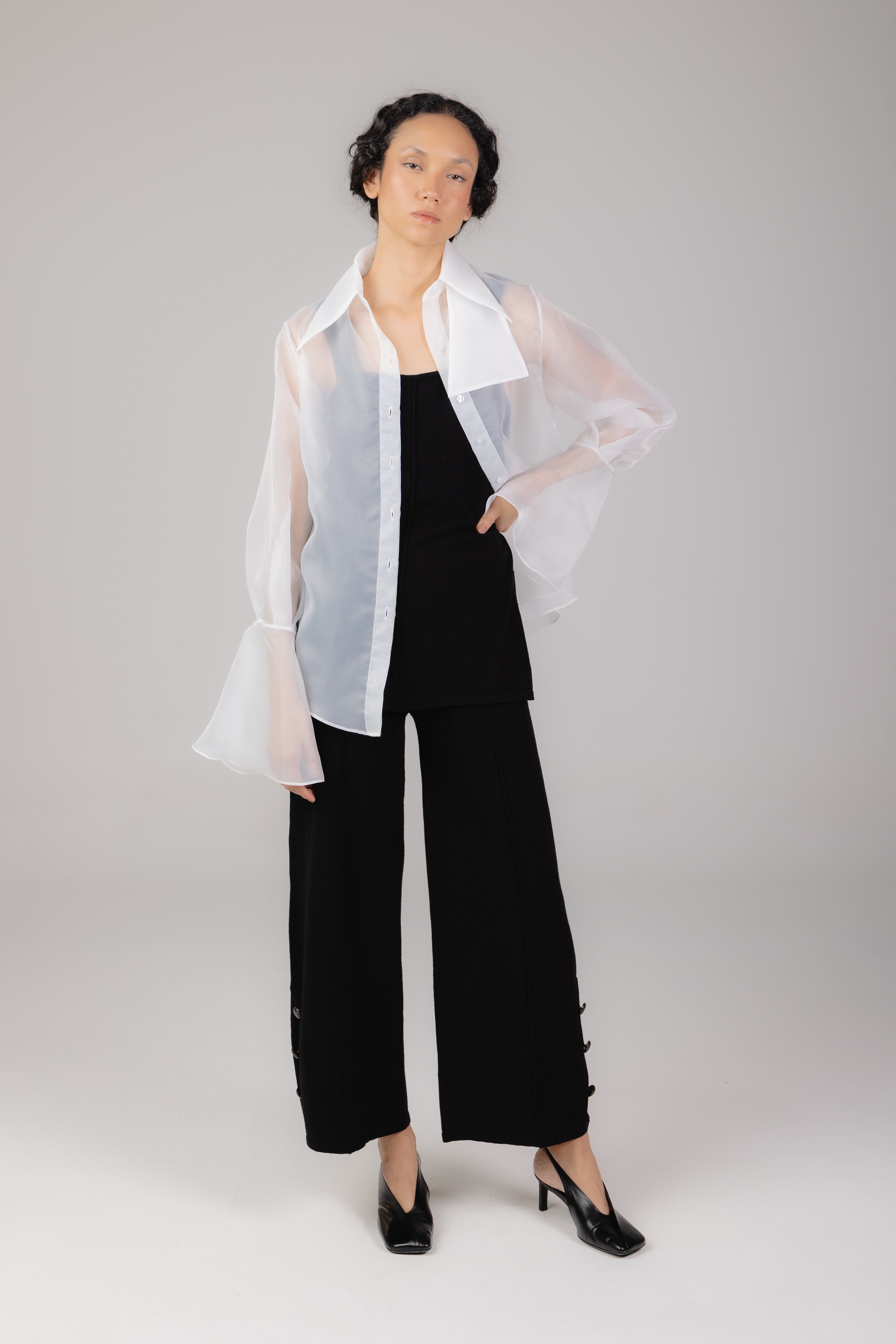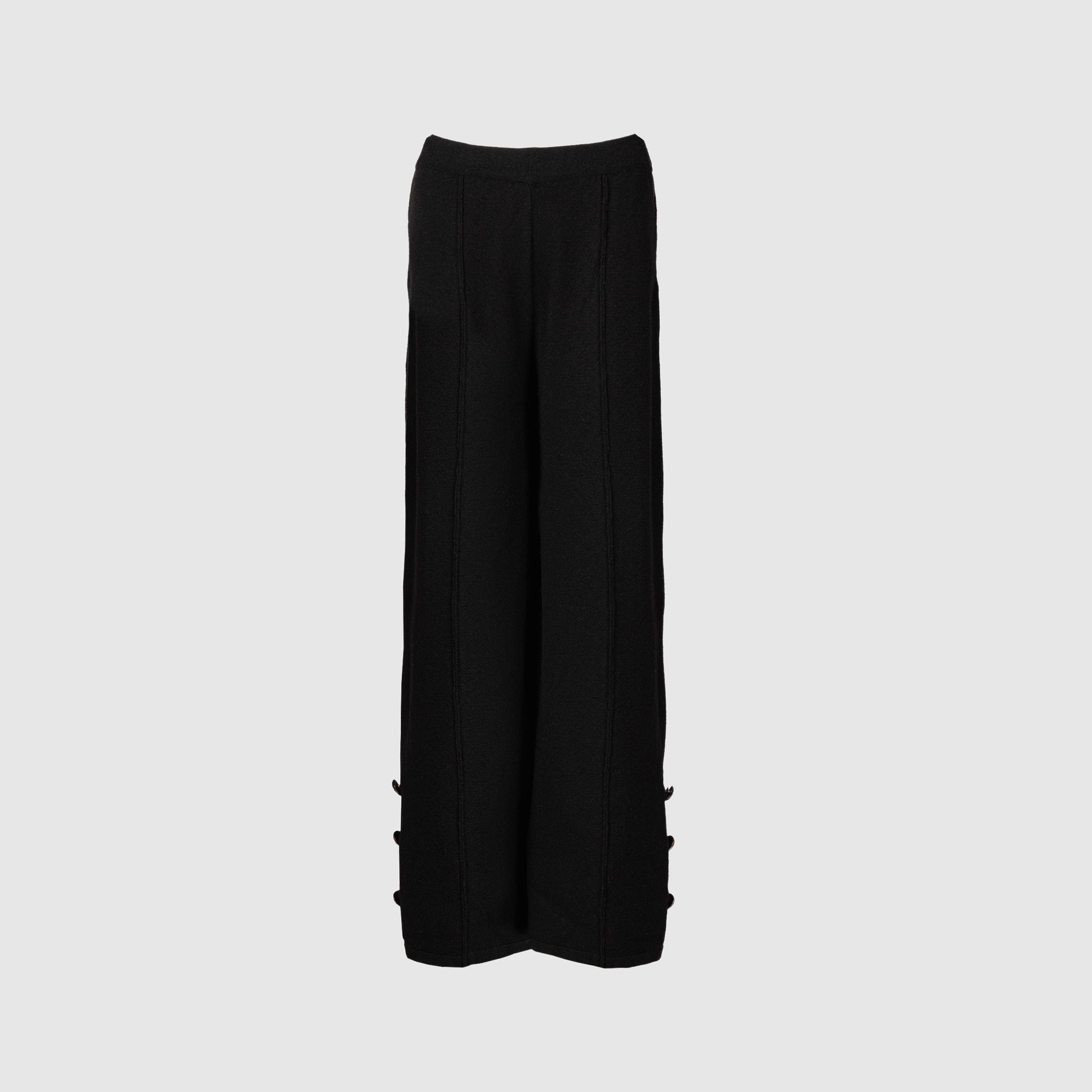 Pantalón recto de punto, con costuras expuestas al frente, aberturas laterales en el bajo y botones decorativos. Una prenda cómoda y sutilmente estructurada para un look relajado con intención.